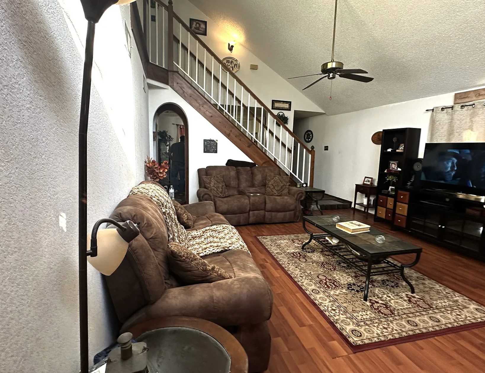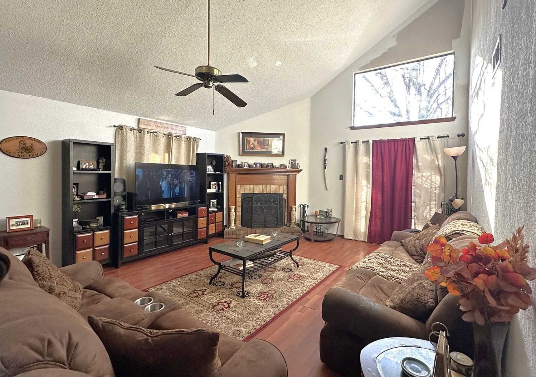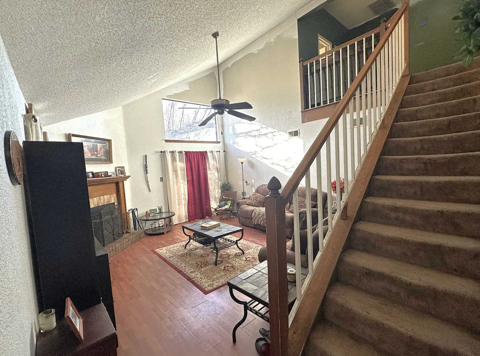 Downstairs features a spacious living and dining area with vaulted ceilings and a decorative fireplace, along with a functional kitchen layout and convenient half bath. Upstairs offers a flexible landing space perfect for an office or second living area, plus a primary suite with attached bath and walk-in closet, and two additional bedrooms.